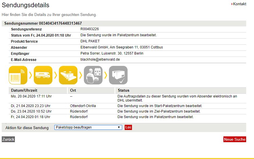 - ersten Trackingcodes/Sendungsnummer beim entsprechenden Dienstleister stoppen bzw. zurück routen >> per Übergabe an den Kundenservice zur Ausführung Einleitung Paketstopp - DPD Paketstopp- Mail an: ingolf.fischer@dpd.de