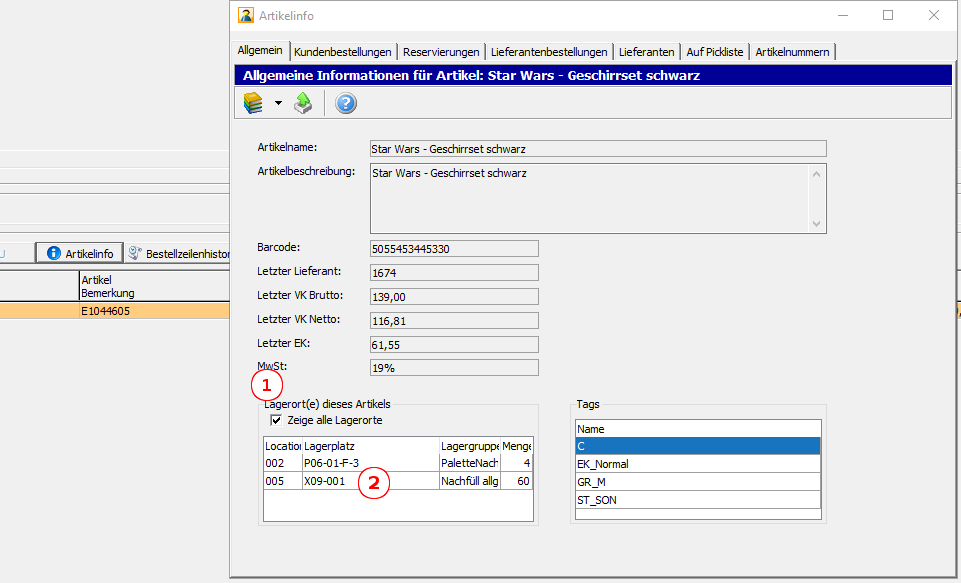 Habt ihr die Artikelinfo geöffnet, aktiviert im Reiter Allgemein unter Lagerort(e) dieses Artikels bitte das Häkchen bei Zeige alle Lagerorte 1 (falls noch nicht geschehen).